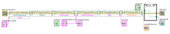 Si on regarde le code source du VI Temperature, on comprend assez facilement le principe. Lorsque que vous utilisez le VI Temperature de la librairie Yoctopuce, un appel est fait à la classe statique YoctoProxyManager. Cet appel sert à obtenir une référence sur l'objet Proxy correspondant au nom de donné en paramètre. En l'absence de nom, l'objet renvoyé correspondra au premier capteur trouvé. Notez que si aucun capteur ne peut être trouvé, on obtient une référence valide mais qui pointe sur un capteur lambda qui se déclare comme "Hors ligne".