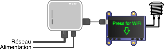 Mais on peut aussi profiter d'avoir une machine capable d'exécuter un programme personnalisé pour y installer un peu de logique. A titre d'exemple, nous vous proposons de d'ajouter au MR3020 la possibilité de travailler comme point d'accès "à la demande", pour fournir un code d'accès temporaire pour visiteurs dans une salle de conférence. Le point d'accès WiFi est désactivé en temps normal (pour des raisons de sécurité), mais à la pression d'un bouton, il est mis en service pour une heure avec un nouveau mot de passe WPA2 choisi aléatoirement et affiché sur un petit écran ad-hoc.