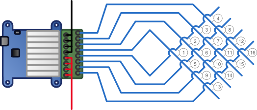 On va donc utiliser un Yocto-MaxiRelay qui dispose de huit sorties. En câblant ses sorties de manière judicieuse, on va pouvoir lancer jusqu'à 16 fusées: en effet si on câble les 8 sorties sous la forme d'une matrice 4*4 on peut gérer jusqu'à 16 connections. Pour la source de courant nous avons choisi une petite batterie de moto 12V: mais un accu NiMh de modélisme aurait probablement pu faire l'affaire.