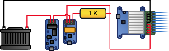 Pendant qu'on y est on va ajouter une petite subtilité: une détection des allumeurs en état de marche: il est en effet relativement facile de casser un allumeur. Pour détecter si un allumeur est est état de marche il suffit de détecter si on arrive à faire passer un courant l'intérieur, de préférence un courant suffisamment faible pour qu'il ne s'allume pas. C'est l'affaire d'un Yocto-PowerRelay, d'un Yocto-Amp et d'une résistance: en mode test, le Yocto-PowerRelay force l'électricité à passer à travers une résistance de 1Kohm, ce qui limite le passage du courant et empêche ainsi l'allumeur de s'enflammer. Si le Yocto-Ampne détecte pas de courant, cela signifie que l'allumeur est cassé ou mal branché.