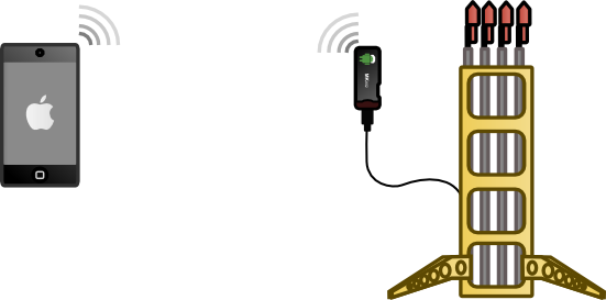 Il reste à résoudre le problème de la télécommande: Comment piloter tous ces modules à bonne distance? l'idée est de redonner une chance au MK802 après le fiasco de la dernière fois. On peut supposer que son réseau WiFi fonctionnera convenablement en plein air. Pour ça on a installé Linux et un Virtual Hub pour ARM sur le MK802, et configuré son WiFi en mode ad-hoc. Ainsi le pas de tir générera son propre réseau WiFi auquel il suffira de se connecter avec un smartphone pour déclencher le tir des fusées. Comme le MK802 n'a qu'un port USB on utilise un Micro-USB-Hub pour connecter les modules Yoctopuce. Le MK802 tout comme les modules Yoctopuce sont alimentés par la batterie grace à un régulateur DC/DC 5v.