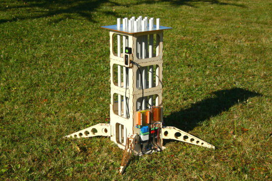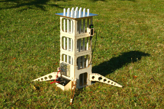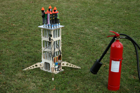 Le pas de tir n'est qu'une structure en bois qui n'a d'autre but que de faire tenir 16 tubes en PVC à la verticale. Ces tubes serviront de guide pour les fusées. Évidement il faut que cette structure soit aussi stable que possible: on n'a pas très envie de voir le pas de tir se renverser au cours du lancement des fusées. Le haut du pas de tir est recouvert avec de d'aluminium adhésif pour éviter qu'il ne prenne feu pendant les tirs. Le gros avantage d'avoir choisi une batterie et un système de télécommande est que le pas de tir est totalement indépendant: on peut le préparer tranquillement dans son atelier. Pour l'installer, il suffit d'aller le poser à l'endroit approprié et de le mettre sous tension.