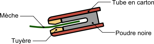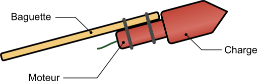 Examinons la structure d'une fusée d'artifice. Elle est constituée de trois parties: une baguette, un moteur et une charge utile. La baguette sert à maintenir l'équilibre en vol, la charge sert pour l'explosion, et le moteur sert évidement à propulser l'ensemble.