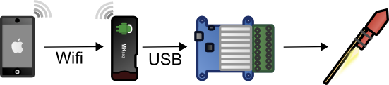 L'idée est d'utiliser le Wifi d'un iPhone pour se connecter sur un MK802, puis ensuite d'utiliser le port USB de ce dernier pour piloter l'allumage de fusées de feu d'artifice via des relais.