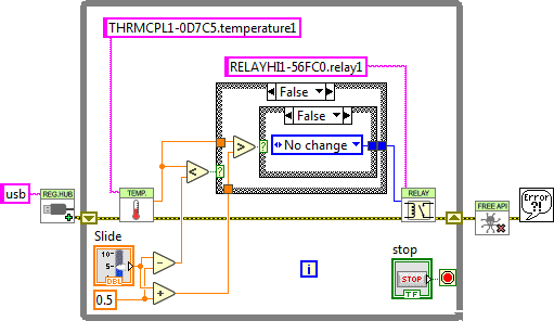 Il va de soi que vous pouvez combiner les VIs, voici un programme qui commute le relais RELAYHI1-56FC0.relay1 en fonction de la température mesurée par le senseur THRMCPL1-0D7C5.temperature1.