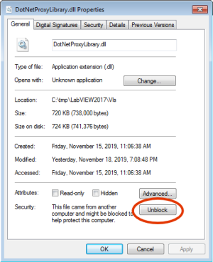 En fonction de sa configuration et de la façon dont vous avez décompressé le fichier zip de la librairie, Windows pourrait être amené à décider que la DLL DotNetProxyLibrary.dll provenant d'un autre machine, elle doit impérativement être bloquée, pour votre propre sécurité. Si LabVIEW n'arrive pas à charger la DLL vous obtiendrez l'erreur n°1386. Vous pouvez résoudre le problème soit en débloquant manuellement la DLL, soit en créant dans le même répertoire que labview.exe, un fichier XML nommé labview.exe.config autorisant le chargement d'assemblages provenant de l'extérieur.
