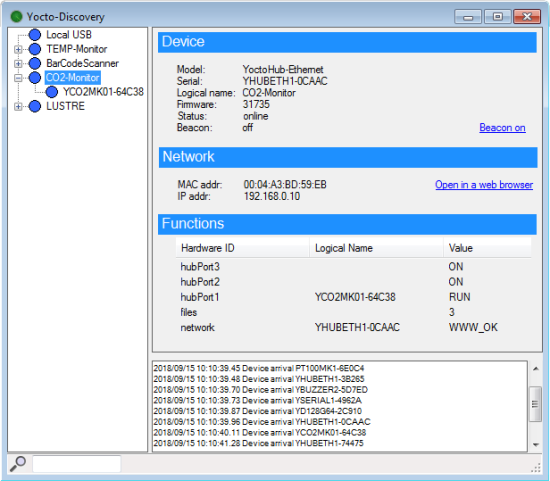 Parce que figurez-vous qu'on a exactement le même problème. Chez Yoctopuce, nous avons en permanence quantité d'expériences connectées au réseau grâce à des YoctoHubs. Et on a beau leur mettre des étiquettes, ça commence à devenir un peu difficile à gérer. C'est pourquoi on a créé Yocto-Discovery, une petite application pour lister tous les modules Yoctopuce présents sur un réseau local.