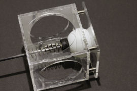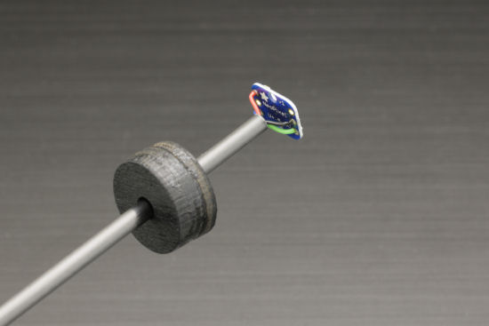 Après avoir vérifié que la LED marchait toujours, on finalement collé ensemble la tige de carbone, le capuchon et la balle à la colle epoxy. Pour être sûrs que la tige et la balle soient bien aligné on a fabriqué un petit dispositif de centrage qui tient le tout ensemble pendant que la colle sèche.