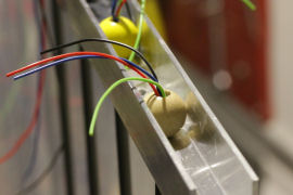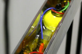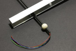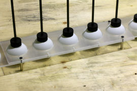Une fois le système suspendu, on s'est rendu compte que l'alignement des balles, quoique raisonnable, n'était pas parfait, et ce malgré l'astuce des perles. On donc fabriqué un gabarit pour aligner les balles, et une fois celui-ci en place on a immobilisé les tiges en versant de la colle époxy dans le profilé. Un conseil: vérifiez que toutes les LEDS fonctionnent avant de tout coller définitivement.