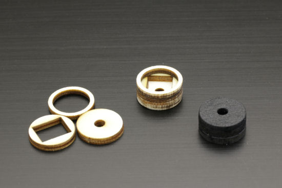 Pour fabriquer les "ampoules", on a commencé par découper trois rondelles dans le contre-plaqué. On les a collé ensemble et peinte en noir. Ce qui donne un espèce de capuchon dans lequel chaque LED sera logée. On pourrait probablement utiliser des bouchons de flacon à la place.