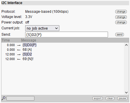 S'il y a quelqu'un à l'adresse testée, il va répondre par un Acknowledge {A} sinon un timeout va se produire. On peut facilement tester le principe avec le VirtualHub. Par exemple si on veut tester la présence d'un chip RTC DS3231 de Maxim dont l'adresse I2C est 0x68, on va essayer d'envoyer {S}D0{P} et on devrait obtenir une réponse se terminant par "{A}". Si personne ne répond, on obtiendra un message se terminant par un point d'exclamation.
