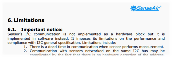 Il faut noter que cette méthode ne permettra pas forcément de détecter tous les périphériques I2C de la création dans la mesure où certains ne sont pas forcément capables de répondre rapidement n'importe quand. Il existe des capteurs dont l'implémentation I2C un peu simpliste les empêche d'honorer une transaction I2C pendant qu'ils sont occupés à faire une mesure. C'est par exemple le cas des capteurs de CO2 SenseAir Kxx.