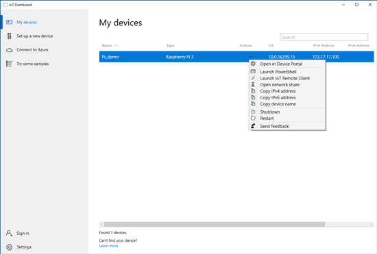 L'autre solution est d'utiliser l'utilitaire "Windows 10 IoT Core Dashboard" que nous avons utilisé pour préparer la carte SD. Si le Raspberry Pi est connecté au même réseau que votre PC, il sera listé dans l'onglet "My device", et depuis là il est possible d’accéder directement au Windows Device Portal.