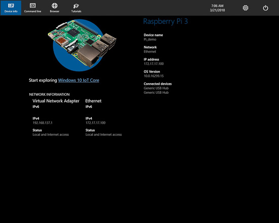 Windows 10 IoT est une version extrêmement minimaliste de Windows 10 prévue pour fonctionner sur des systèmes embarqués ou des objets connectés. En fait, il ne s’agit pas d'un Windows dans le sens où la plupart des gens l'entendent: Il n'y a pas de menu démarrer, pas de système de fenêtrage et seules les applications de type Windows Universel (UWP) sont utilisables.