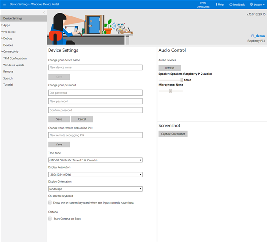 Par défaut, Windows utilise la résolution 1280x1024 qui n'est plus vraiment très utilisée. La première chose à faire est donc de changer la résolution pour qu'elle corresponde à votre écran, dans notre cas 1920x1080. Pour changer ce paramètre, il faut se connecter au "Windows Device Portal" depuis un browser web.