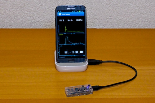 Si l'on installe notre application Yocto-Meteo et que l'on branche un Yocto-Meteo sur un port USB du dock, l'application se lance automatiquement et fonctionne parfaitement. La librairie Yoctopuce détecte toujours le module comme si il était connecté directement au téléphone par USB. Dans cette configuration, le téléphone et le Yocto-Meteo sont alimentés par le dock, et l'application peut donc fonctionner en permanence. Pour être honnête, on ne sait pas encore très bien comment Samsung a fait ce petit miracle (probablement en prenant quelques libertés par rapport au standard USB...), mais nous investiguerons ceci plus profondément. Seule petite limitation, qui mérite d'être mentionnée: le dock a besoin d'être alimenté pour maintenir la connexion entre les modules et le téléphone. Si vous débranchez le chargeur, le téléphone va détecter une déconnexion du module Yoctopuce.