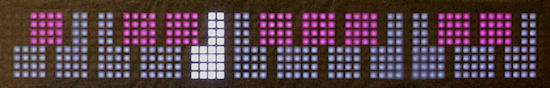 Pour afficher les notes à jouer, on va réutiliser notre afficheur NeoPixel construit pour un précédent projet. Les pixels sont représentés comme un tableau de couleurs HSL. On définit dans un autre tableau Python la forme des notes de la gamme sur le clavier, par les coordonnées des lignes de pixels à allumer, et on l'utilise dans une fonction qui peut dessiner n'importe quelle note à la luminosité choisie: