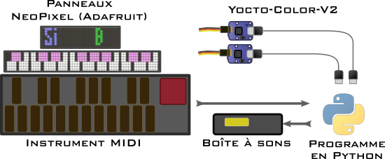 Mis à part l'instrument MIDI, ce projet nécessite un écran aussi grand que l'instrument, pour pouvoir montrer à l'utilisateur où se trouve chaque note qu'il doit jouer. C'est là qu'interviennent les modules Yoctopuce: ils nous permettent de piloter une série de dalles RGB NeoPixel disposées en ligne, formant un écran de 60cm de long que l'on peut disposer juste à côté des notes. Voici le schéma de l'installation: