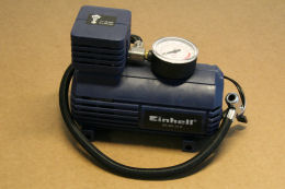 Le compresseur est un compresseur 12V fonctionnant sur allume-cigare, acheté 20 francs au magasin du coin de la rue. On l'a débarrassé de son habillage en plastique, et on l'a vissé sur un support.