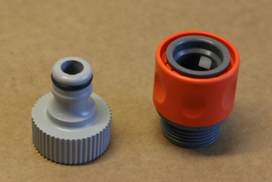 Les fusées à eau artisanales sont souvent basées sur ces embouts de tuyau d'arrosage qui se verrouillent automatiquement. La partie mâle est collée sur le goulot de la bouteille et la partie femelle, qui contient un système de verrouillage, est raccordée à un tuyau planté dans le sol lui-même raccordé à une pompe à vélo, c'est le lanceur.