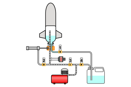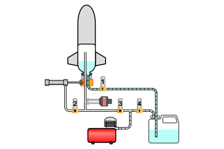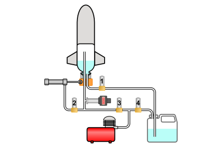 Une fois le remplissage terminé, on isole le circuit d'eau en fermant les vannes 1 et 4, puis on ouvre la vanne 3 et on continue de pomper jusqu'à ce que la pression dans la bouteille soit jugée suffisante. On arrête alors de pomper et on ferme la vanne 3. La fusée est prête au lancement.