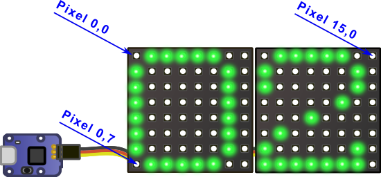 Comme nous l'avons dit, dans certaines situations, la seule solution est de calculer chaque frame de l’animation, et de mettre à jour toutes les LEDs. Pour illustrer cette situation, nous allons voir comment réaliser un mini-écran de 16x8 pixels à l'aide de deux panneaux de 8x8 LED Neopixel chaînés l'un à l'autre.