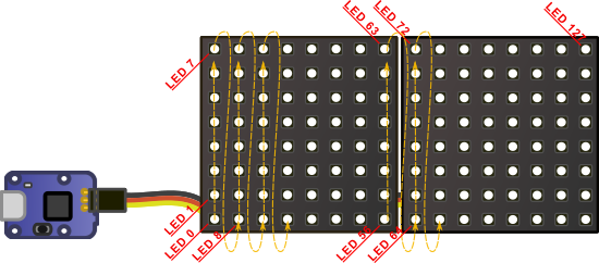Dans cet exemple, nous avons organisé nos LEDs pour qu'elles forment un rectangle de 16x8, mais la même technique peut être utilisée pour d'autres topologies.