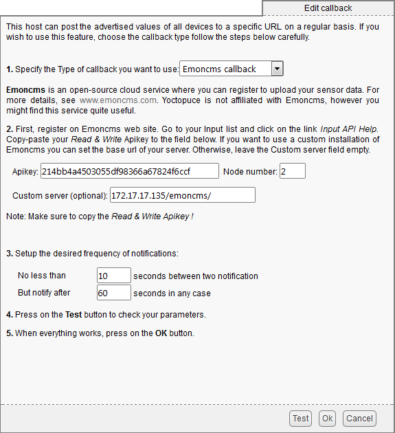 Pour le cas où vous aviez déjà configuré Emoncms sur votre YoctoHub avant de mettre à jour le firmware, il faut ouvrir le wizard de configuration du callback HTTP et le sauvegarder. Normalement, tous vos paramètres sont préservés mais il faut spécifier un node Id sinon le YoctoHub ne fonctionnera pas avec les nouvelles version d'Emoncms.