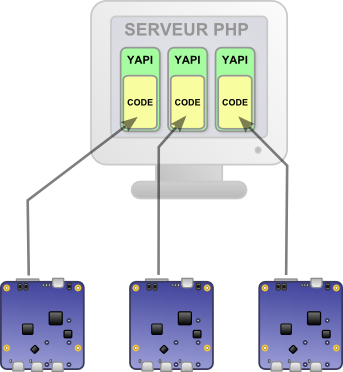 En PHP, chaque requête est exécutée dans un nouveau processus, ainsi chaque requête est appelée avec un espace mémoire propre à la requête. A contrario, en Java toutes les requêtes sont exécutées dans le même processus mais dans des threads séparés et l’espace mémoire est partagé. Si c’est plus efficace car on n'a pas besoin de créer un nouveau processus, cela implique que deux Yocto-Hub qui se connectent en même temps vont se battre pour accéder aux caches internes de l’API Yoctopuce.