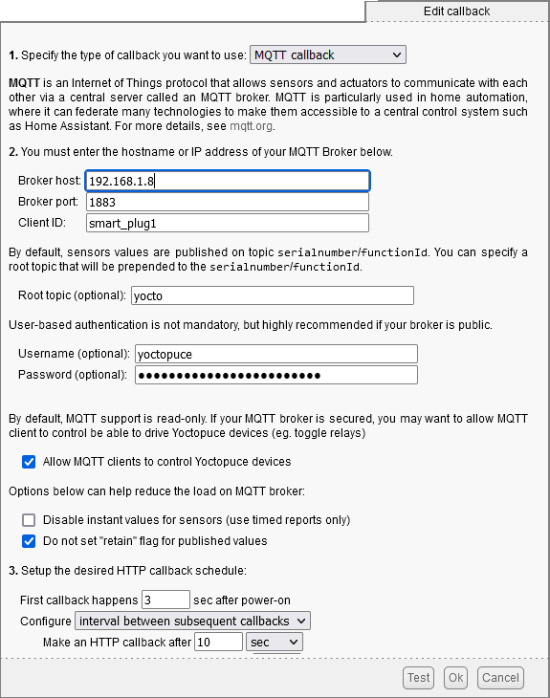 Maintenant que le Home assistant et le broker MQTT sont installés, il faut configurer le callback HTTP du YoctoHub-Wireless-n sur lequel le Yocto-Watt est monté. Il faut configurer un callback de type MQTT et rentrer l'adresse IP de notre Raspberry Pi.
