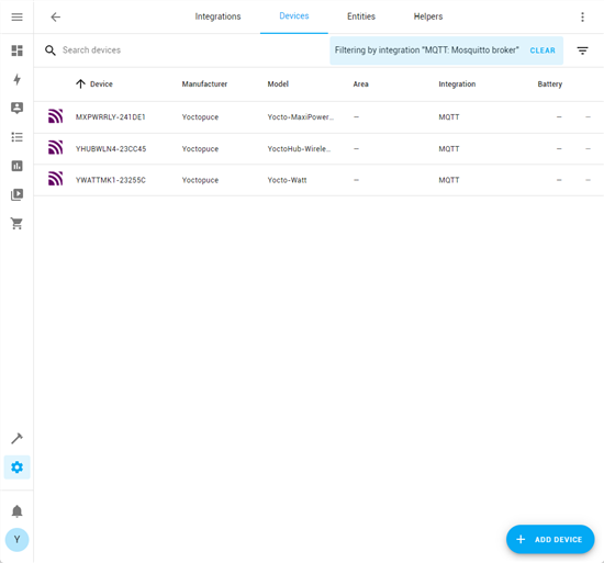 Une fois le callback configuré, les modules Yoctopuces vont apparaître automatiquement dans la liste des devices Home assistant.
