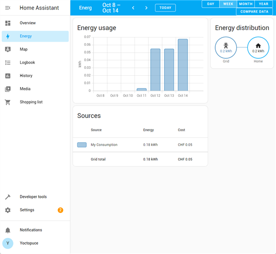 Home Assistant a un panneau "Energy" qui permet de surveiller et d'afficher la consommation électrique de l'installation. Ce panneau est fort pratique si l'on cherche à optimiser sa consommation électrique, car il permet d'afficher l'historique de l'énergie consommée. Cependant, le Yocto-Watt n'est pas utilisable directement dans ce panneau.