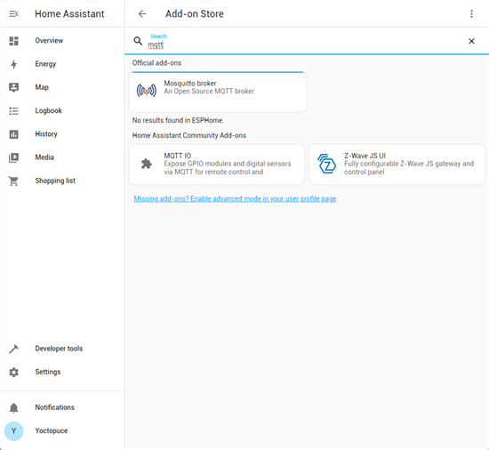 Comme nous l'avons expliqué dans un précédent article, la meilleure solution pour relier nos rallonges intelligents est d'utiliser un broker MQTT. Le broker MQTT Mosquitto est disponible comme Add-on. Il suffit de rechercher MQTT dans l'Add-on Store depuis l’interface de Home Assistant. L'utilisation de cet add-on est très facile, car en plus d'installer Mosquitto, le script d'installation ajoute automatiquement les fichiers de configurations nécessaires dans Home Assistant.