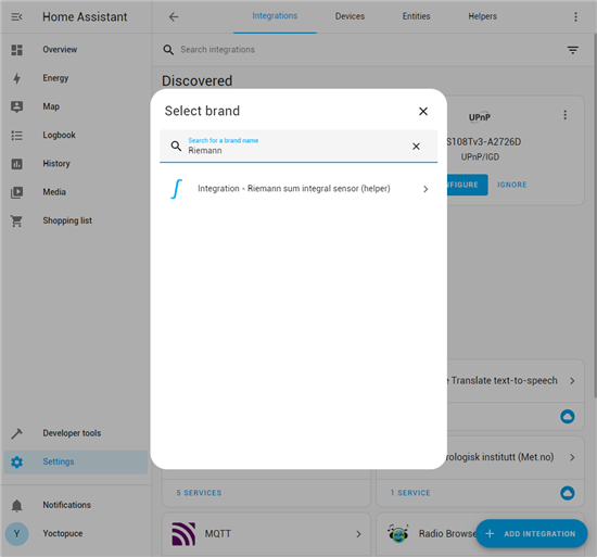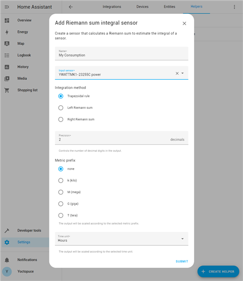 Pour utiliser cette fonctionnalité, il faut se rendre dans les paramètres et ajouter une intégration "Riemann sum integral". Cela va créer une nouvelle entity qui sera l'intégration d'un capteur. Dans notre cas, on choisit le capteur de puissance du Yocto-Watt et on lui donne le nom "My Consumption".