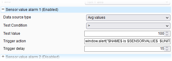 La version native mets à disposition deux alertes configurables par capteur qui peuvent exécuter la commande système de votre choix lorsqu'elles se déclenchent. Évidement pas question d'en faire autant avec la version web. À la place, vous pouvez exécuter une ligne de JavaScript. Cela pourrait être utile si vous faites tourner Yocto-Visualization (for web) dans votre propre page web.