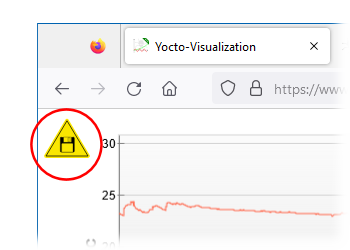 La version native de Yocto-Visualization sauve automatiquement sa configuration lorsque que vous quittez l'application. Pour la version web, il est apparu qu'il n'était pas possible d'en faire autant lorsque l'utilisateur quitte la page web qui affiche l'application, en tout cas pas de façon fiable. C'est donc à l'utilisateur de ne pas oublier de sauver après une modification. Pour aider les têtes en l'air, Yocto-Visualization affiche une icône de disquette en haut à gauche de l'écran pour indiquer qu'une modification eu lieu, il suffit de cliquer dessus pour sauver.