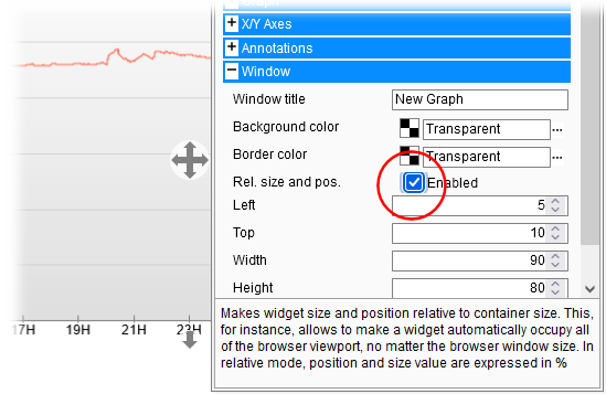 Pour imiter le comportement de la version native, la taille et la position des afficheurs sont par défaut indiquées en valeurs absolues. Mais comme il y a peu de chances que la taille du navigateur qui affiche Yocto-Visualization (for web) soit la même à chaque fois, il est aussi possible de définir la position et la taille des afficheurs de façon relative. Si, dans la section Window, vous activez l'option Rel. size and pos., la position et la taille de l'afficheur correspondant sont alors traitées comme un pourcentage relatif à la taille de la fenêtre du navigateur web.
