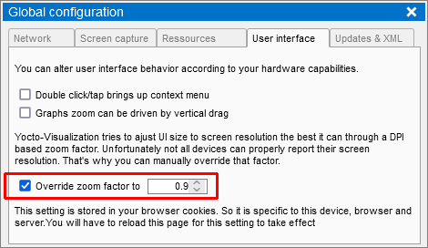 Yocto-Visualization (for web) tournant dans un navigateur web, il peut être utilisé sur une grande variété de matériels, du desktop au téléphone portable en passant par les tablettes. Ce qui veut dire qu'il peut être affiché sur des écrans avec des densités très différentes. C'est pourquoi Yocto-Visualization (for web) essaie d'adapter automatiquement les tailles des interfaces et surtout des textes pour qu'ils restent lisibles sans occuper trop de place. Cependant, détecter par software la densité d'un écran est loin d'être une science exacte. C'est pourquoi Yocto-Visualization (for web) propose aussi de définir manuellement dans la configuration globale le facteur de zoom à utiliser pour l'affichage. Ce réglage est stocké sous forme de cookie dans votre navigateur et est donc spécifique au navigateur et au serveur qui sert l'application Yocto-Visualization (for web).