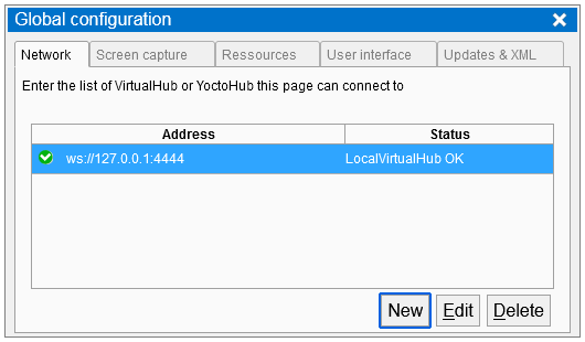 Yocto-Visualisation (for web) n'a pas directement accès aux ports USB de la machine sur laquelle il tourne, et c'est tant mieux. Qui a envie qu'un site web arbitraire puisse accéder à ses périphériques USB? Pour utiliser des modules Yoctopuce branchés sur la machine locale, il faut donc faire tourner un VirtualHub et ajouter son adresse 127.0.0.1, port 4444 dans la liste des hubs que Yocto-Visualisation (for web) doit utiliser.