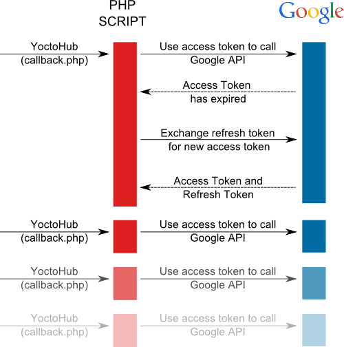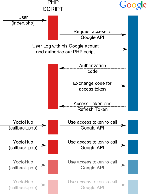 Avant d'appeler les fonctions de l'API Google, il faut être capable de stocker les tokens entre chaque exécution. Dans ses exemples, Google utilise les variables de session. Cette solution fonctionne parfaitement si on utilise un browser Web qui gère correctement les cookies, mais le YoctoHub ne supporte pas cette option. Il faut donc sauver les tokens dans un fichier ou dans une base de données. Il faudra donc implémenter trois fonctions (clearTokenInDb, updateTokenInDb, getTokenFromDb).