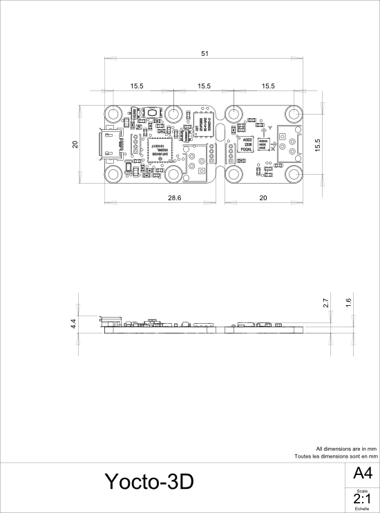 Le Yocto-3D est un module électronique de 51x20mm qui dispose d'un accéléromètre, d'un gyroscope et d'un magnétomètre, tous tri-dimensionnels. Le Yocto-3D utilise ces trois senseurs pour mesurer l'inclinaison par rapport au plan l'horizontal (inclinomètre), l'orientation par rapport au Nord magnétique (compas compensé en inclinaison), l'accélération et le champ magnétique auquel est soumis le module ansi que la vitesse angulaire sur les 3 axes.