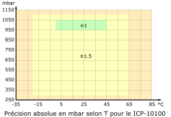 Le capteur ICP-10100 est fabriqué parTDK invensense. Il est étanche à l'eau pour des faibles immersions. Il permet de mesurer très précisément la pression atmosphérique de 250 à 1150 mbar3, ce qui correspond en atmosphère standard à une plage de -1000 mètres à 10'000 mètres. La précision absolue est de +/-1 mbar entre 950 et 1050 mbar et entre 0°C et 65°C, et la précision relative est de +/-0.01 mbar sur une variation de 10mbar entre 950 et 1050mbar, ce qui correspond à 10cm environ. La précision absolue est légèrement moins bonne dans les températures extrêmes, mais contrairement à beaucoup d'autres capteur, elle reste spécifiée à +/-1.5 mbar sur la plage étendue entre 300 mbar et 1100 mbar, de -20°C à 65°C.