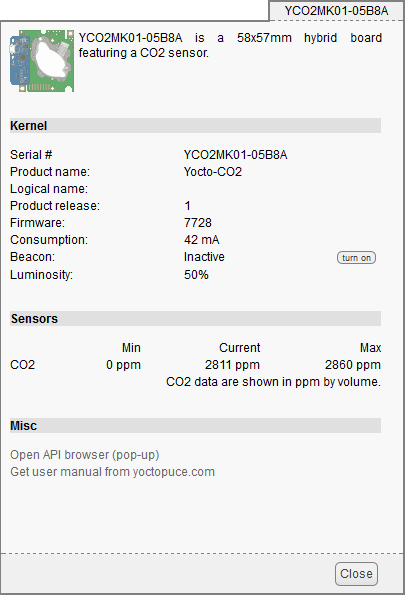 La première chose à vérifier est le bon fonctionnement de votre module: cliquez sur le numéro de série correspondant à votre module, et une fenêtre résumant les propriétés de votre Yocto-CO2.