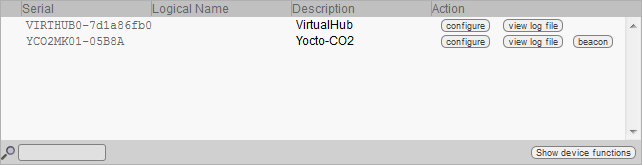 La seule fonctions fourni par le module Yocto-CO2 et la fonction "CarbonDioxide" Cliquez simplement sur le bouton "rename" correspondant pour lui affecter un nouveau nom logique.