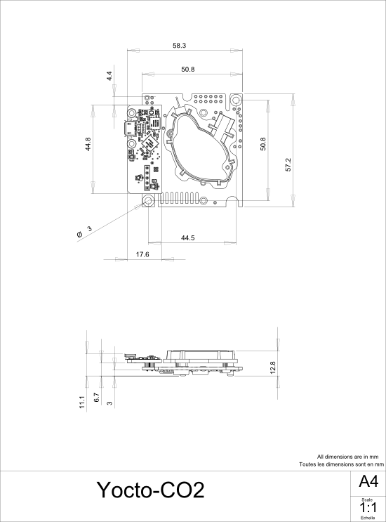 Le module Yocto-CO2 est un module de d'environ 58x57mm mm qui permet de mesurer par USB le taux de C02 présent dans l'air jusqu'a concurrence de 10000 ppm . Sa précision est de 30 ppm 5%. Le Yocto-CO2 est basé sur un module K30 de SenseAir.