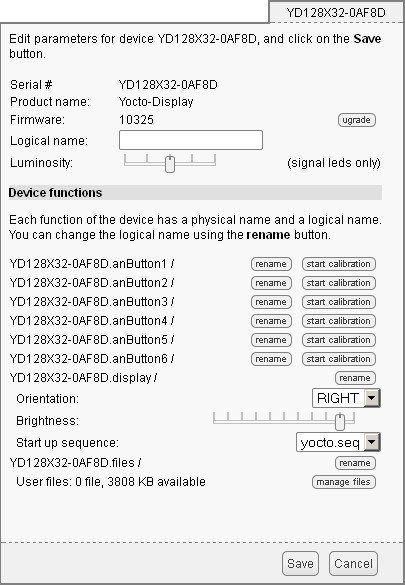 Chaque Yocto-module a un numéro de série unique attribué en usine, pour les modules Yocto-Display ce numéro commence par YD128X32. Le module peut être piloté par logiciel en utilisant ce numéro de série. Ce numéro de série ne peut pas être changé.