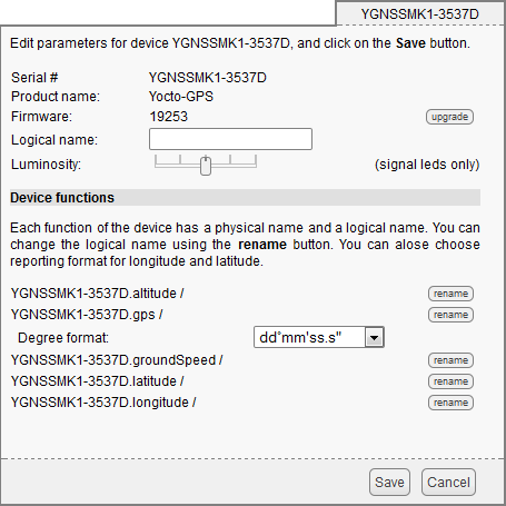 Le Yocto-GPS dispose de plusieurs fonctions auxquelles vous pouvez assigner un nom logique en cliquant sur le bouton "rename".
