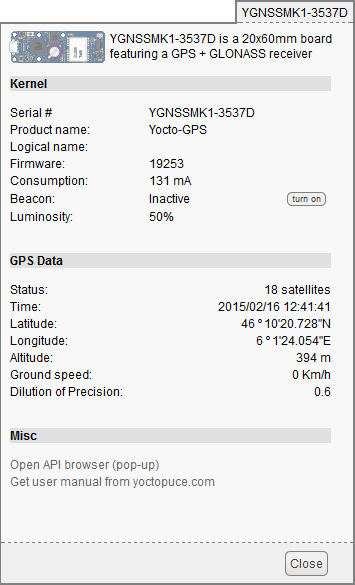 La première chose à vérifier est le bon fonctionnement de votre module: cliquez sur le numéro de série correspondant à votre module, et une fenêtre résumant les propriétés de votre Yocto-GPS.