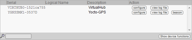 Il est alors possible de localiser physiquement chacun des modules affichés en cliquant sur le bouton beacon, cela a pour effet de mettre la Yocto-Led du module correspondant en mode "balise", elle se met alors à clignoter ce qui permet de la localiser facilement. Cela a aussi pour effet d'afficher une petite pastille bleue à l'écran. Vous obtiendrez le même comportement en appuyant sur le Yocto-bouton d'un module.