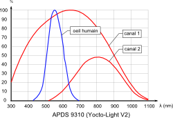 Le capteur ADPS-9301 du Yocto-Light-V2 travaille différemment: il utilise deux détecteurs distincts, sensibles à des spectres différents, et dont les réponses peuvent être combinées pour reconstituer une perception estimée de l'oeil humain. Ces détecteurs sont plus sensibles et plus réactifs que le SFH5712, et permettent donc des mesures plus rapides et en plus faible luminosité.